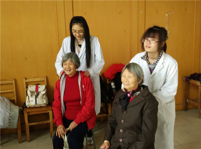 另一旁负责按摩的同学也没闲着,他们手法娴熟,用力得当,让大妈们得到了实实在在的舒适。在与他们聊家常的过程中,我们了解到他们的子女大多不在身边。与其说我们是为他们提供健康咨询服务,不如说更多的是给予心灵上的慰藉。我们的年龄或许正好与他们孙辈相符,他们见到我们,仿佛就像见到了自己的孙辈在医学道路上求索。老人们也会鼓励我们要努力学习,将来救死扶伤,成一代名医。他们的殷切期望无疑是这萧瑟秋日中的一壶热茶,它将激励我们在医路上一往无前。