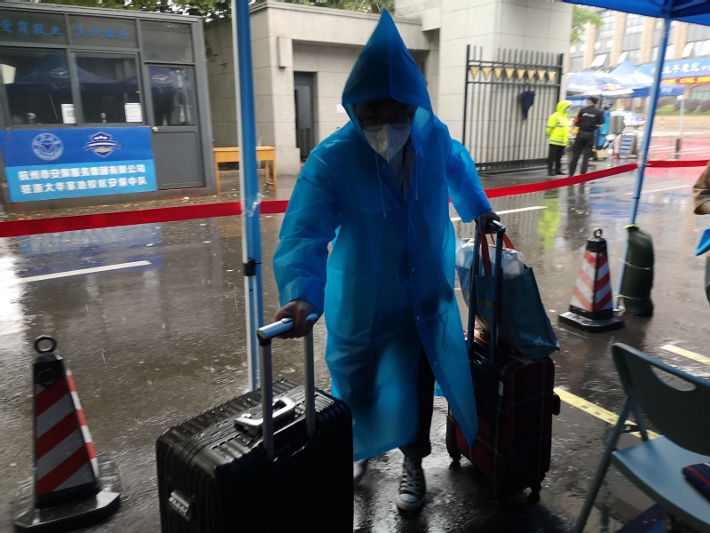 不巧,55日上午,猛烈的暴风雨突袭杭州,进校通道一度被积水淹没,而返校的同学依然不断出现在校门口。志愿者穿着蓝色的雨衣往返在报到点和接驳车停靠站中间短短三十米的路上,他们的脚步在混着枯枝落叶的积水中留下一个个足印,但眼中依然透露出坚定的光。