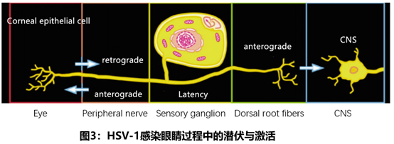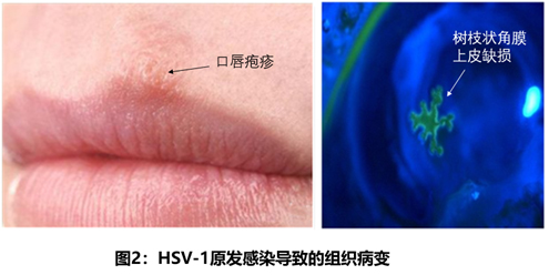 HSV-1是一种普遍感染人类的病毒,可以导致多种疾病,如眼睛感染(特别是复发性角膜炎)、脑炎、口唇疱疹等,是引起眼科致盲的最重要的病因之一(图2)。人一旦感染该病毒后,病毒的基因就会进入三叉神经等感觉神经节形成终身潜伏。在某些激活因素作用下,如过度疲劳、过度紧张、过多接受紫外线等,病毒会从潜伏状态重新激活复制,再次引起原先感染部位或者其它器官的复发感染(图3)。